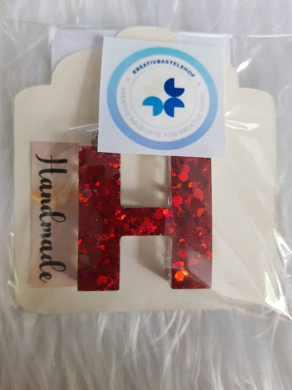 Handgegossene Schlüsselanhänger Buchstabe aus Epoxidharz mit Glitzer und klarem Harz.