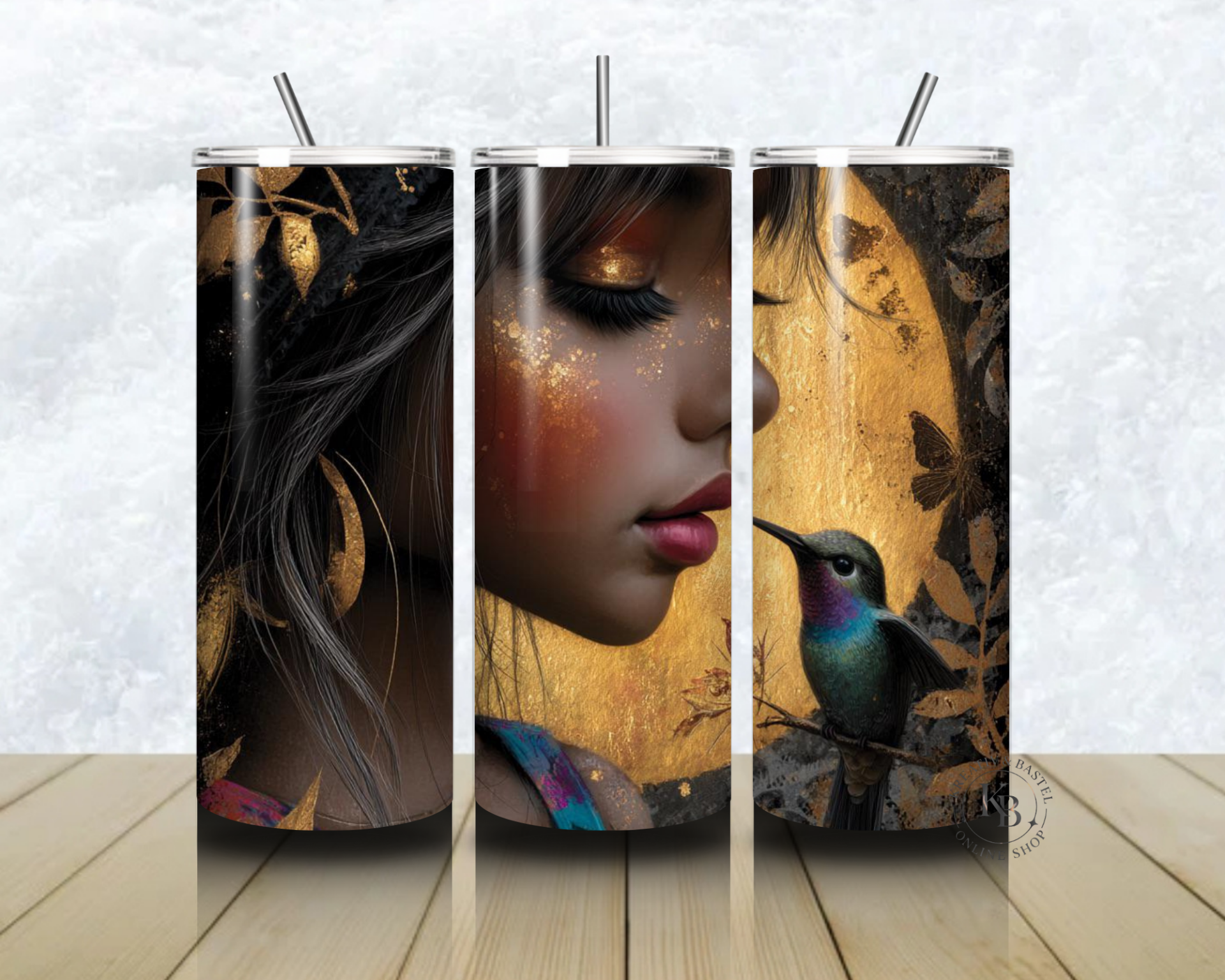 🌙✨ Thermobecher – „Goldene Stille – Mädchen & Kolibri“ – 20 OZ inkl. Strohhalm